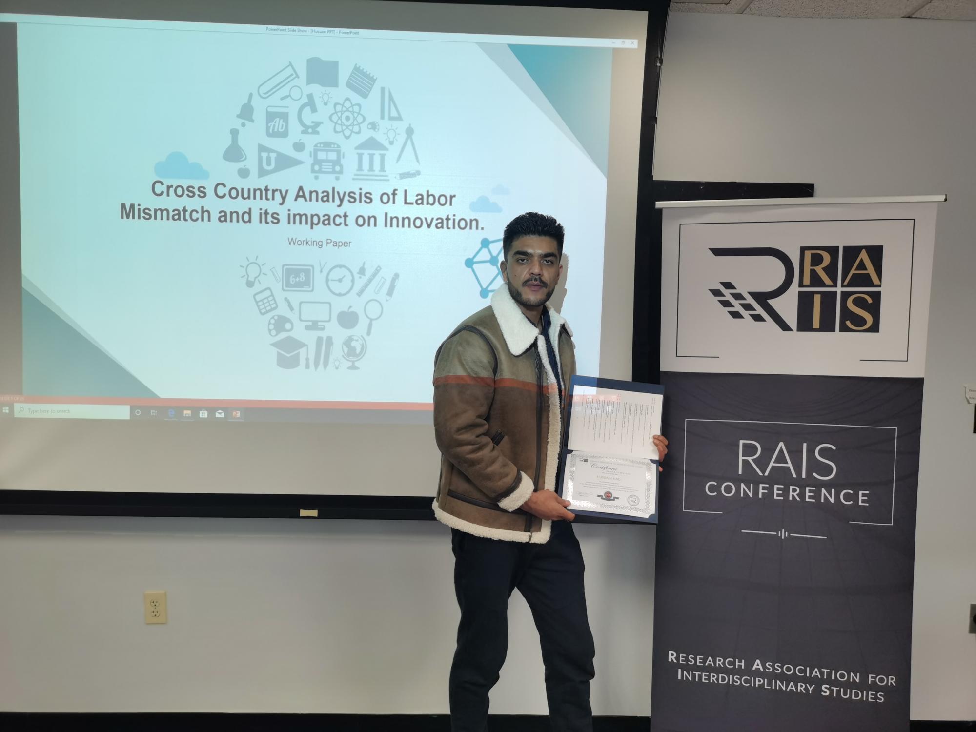 博士生Hussain Hadi (侯赛因·哈迪)参加了此次学术盛会。在温军教授的悉心指导下,提交了一篇题为:Cross Country Analysis on Labor Mismatch and its impact on Innovation (“劳动力错配及其对创新影响的跨国分析”)的研究论文,并发表了相关主题演讲。